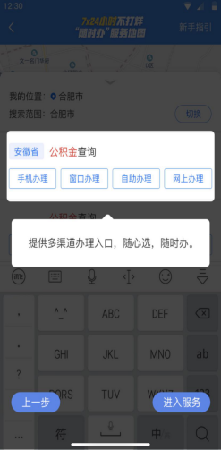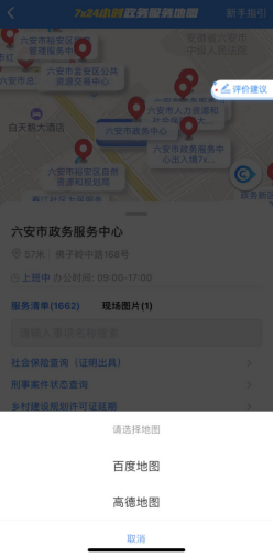 进入皖事通APP·六安站,点击“7x24小时政务服务地图”后进入地图模式,输入要办理的事项名称或要前往的场所地址。