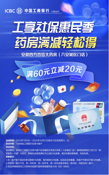 在安徽四方百信大药房(六安城区门店),客户使用微信支付绑定六安工商银行“居民服务一卡通”卡支付,可享满60元立减20元。单卡每日限享1次,每月限享2次。