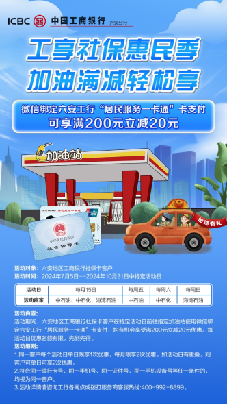 在指定中石油(16家)加油站,客户使用微信支付绑定六安工商银行“居民服务一卡通”卡支付,可享满200元立减20元。单卡每日限享1次,每月限享2次