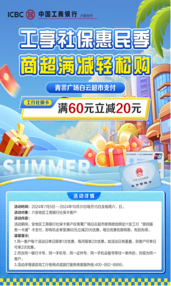 在青雲广场白云超市,客户使用微信支付绑定六安工商银行“居民服务一卡通”卡支付,可享满60元立减20元。单卡每日限享1次,每月限享2次