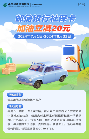每周六、周日上午8点开始,在六安市中国石化六安市及四个县域加油站点,使用支付宝绑定邮储银行社保卡消费满200元立减20元,持卡人同一用户活动期间每日限享1次优惠,每月限享2次优惠,先到先得,额满即止。